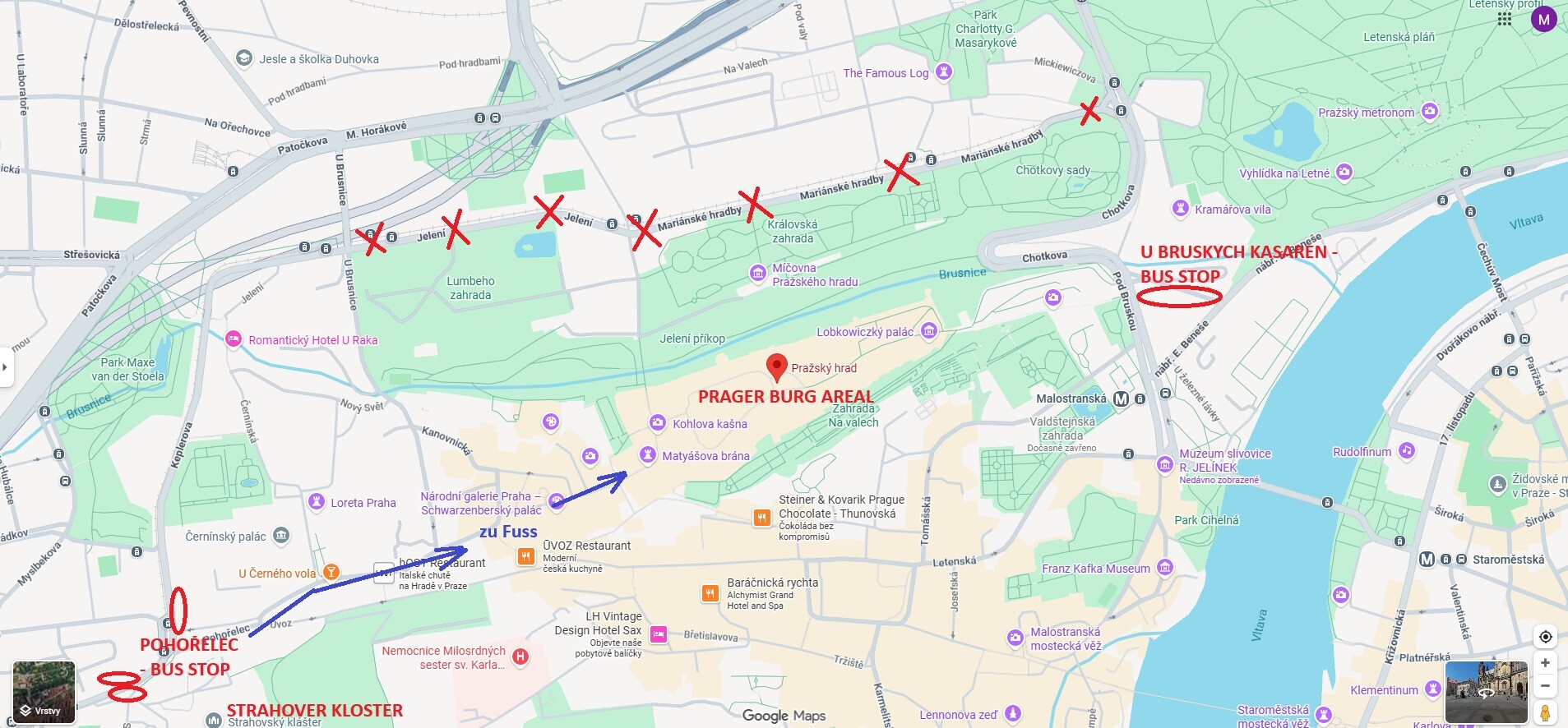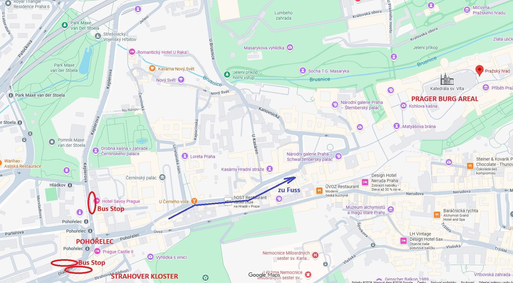 Nach aktuellem Stand ist der einzige praktikable Zugang zur Prager Burg zu Fuß über den Pohořelec möglich. Dies ist auch unsere Empfehlung. Zusätzlich wird dort eine temporäre Halte- und Ausstiegsstelle für Busse (nahe Hotel Savoy) eingerichtet.