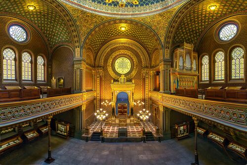 Etwas weniger bekannt, aber absolut sehenswert ist die Jeruzalémská-Synagoge, auch bekannt als die Jubileums-Synagoge. Sie liegt etwas außerhalb des touristischen Zentrums, in der Jeruzalémská Straße, und überrascht mit ihrer orientalischen Fassade und den farbenprächtigen Jugendstil-Details im Inneren. Viele Gäste sind begeistert, weil diese Synagoge oft nicht im Standardprogramm enthalten ist – ein echter Geheimtipp für Gruppen, die das Besondere suchen.
